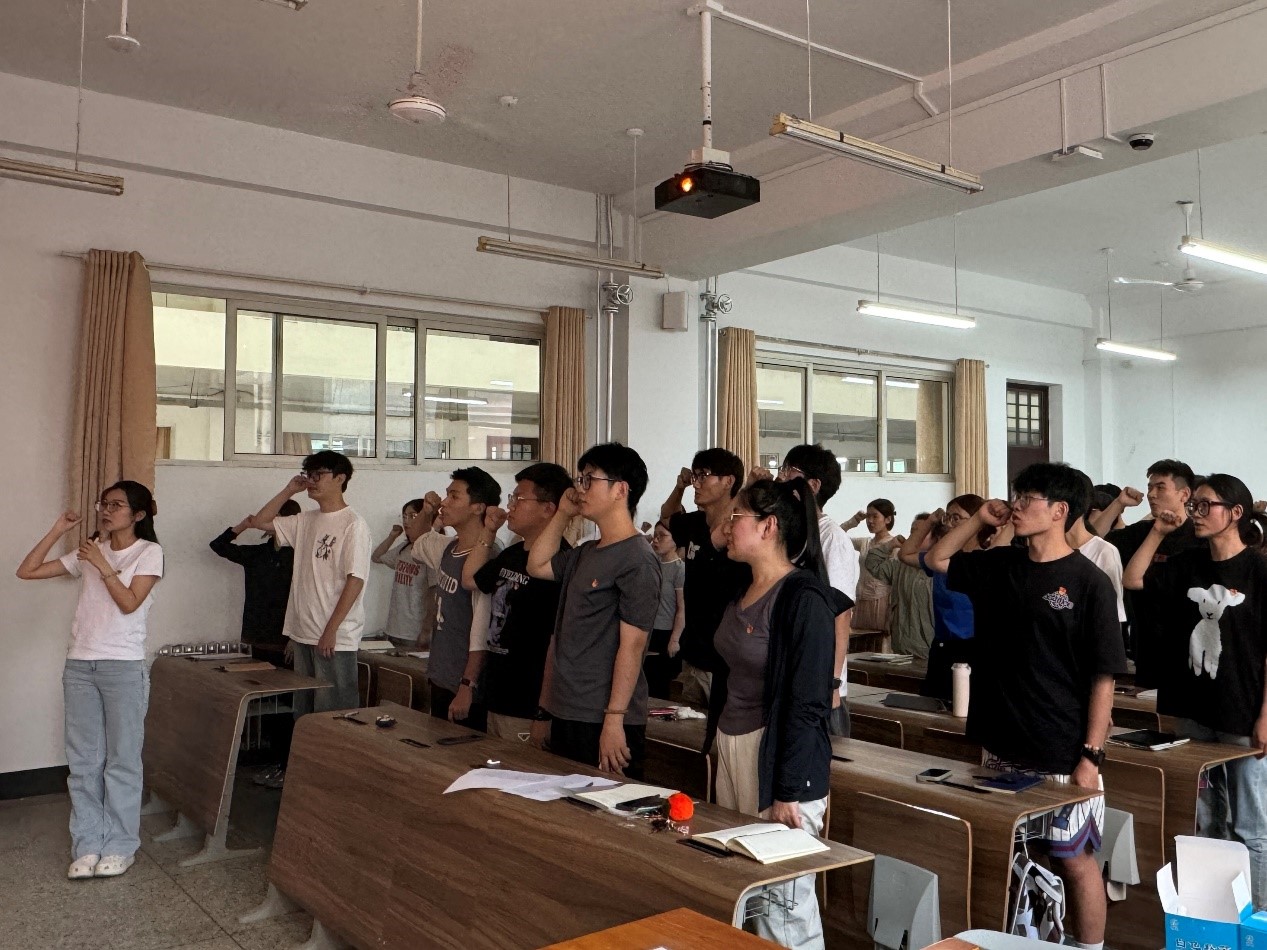 随后,在领誓人孔孜涵的带领下,全体党员起立,举起右拳,重温入党誓词,庄严宣誓,表达了身为新时代共产党员的责任与担当。誓言回荡在教室之中,不仅是对信仰的再次确认,也是对党员身份的深刻认同,提醒每一位党员不忘初心,砥砺前行。
