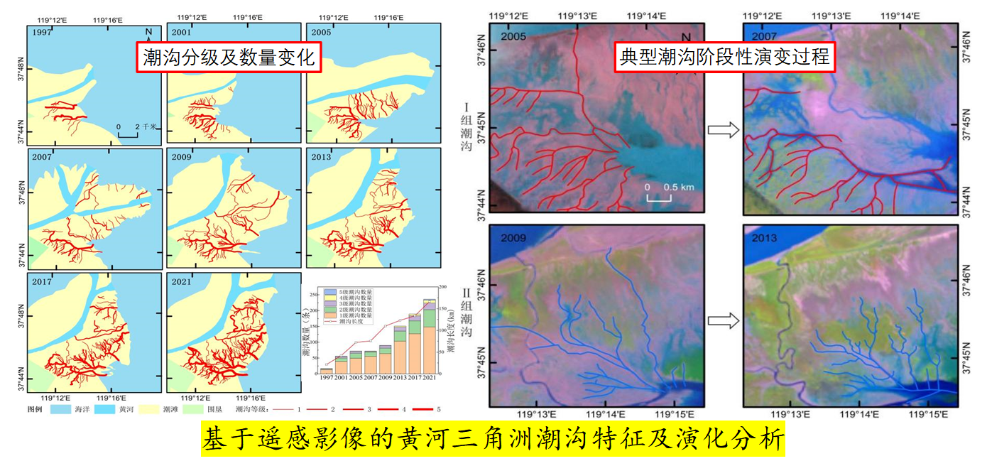 实验室及其团队成员前期基于1997-2021年8期Landsat系列遥感影像,分析了黄河三角洲潮沟数量、长度、密度等特征,并初步揭示了潮沟阶段性演变规律。今后实验室将持续跟踪黄河三角洲潮滩动力地貌演化过程和生态保护,定期开展黄河下游的实地调查,为黄河三角洲湿地的开发与保护提供科学支撑,为深入实施黄河重大国家战略作出贡献。