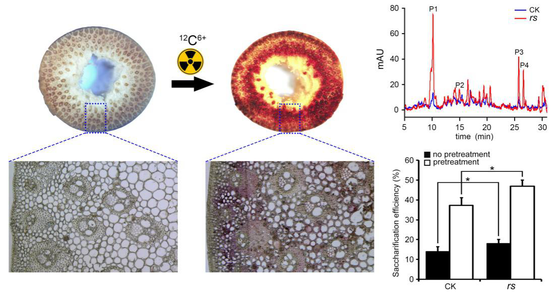 近年来,重离子辐射诱变育种已经成为植物育种的重要手段之一,取得了显著的经济和社会效益。周功克教授团队利用重离子辐射诱变获得芒草突变体库。经过大量筛选获得一株红杆突变体,其韧皮部和维管束鞘的木质化细胞壁中呈现明显的淡红色,而生物量几乎不受影响。与对照相比,红杆突变体的木质素含量降低了约10%,而纤维素含量增加了9.5%,特别是糖化效率则提高了约15-22%。这些研究丰富了重离子辐射诱变育种的证据,同时也为黄河三角洲盐碱地绿色开发奠定了重要的种质资源基础。
