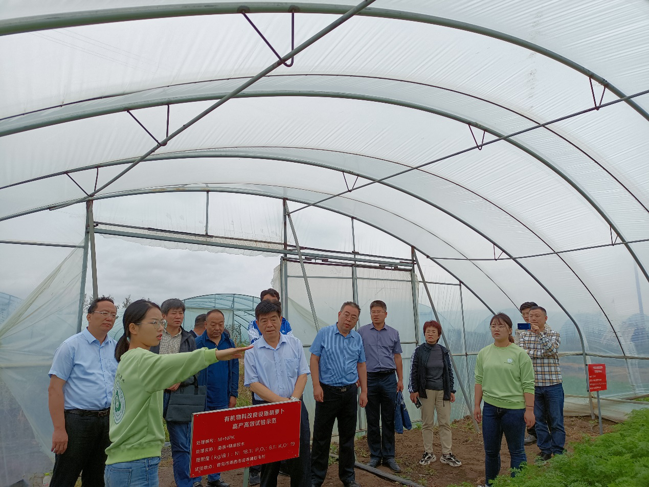 考察团一同参观了基地实验室、展厅、办公区、农民培训室、员工宿舍及青岛市有田公司的示范园区。产教融合基地是以高校、政府和企业多方联合运作,其目标是打造农科应用型研究生人才培养的示范基地,掌握先进农业生产技术的推广队伍和管理队伍,建立以“基地”为核心辐射全省的新型农科应用型研究生实践培养网络化运行模式。在参观过程中,崔德杰经理对产教融合基地的员工开展工作状况、莱西科技小院的精神内涵和时代使命、基地的组织框架、管理模式和运行机制及公司产品机制进行了系统介绍,郭梦瑶对产教融合基地的建设、基地生活和感受等情况向大家做了介绍。随后,考察团参观了基地胡萝卜有机替代和滴灌水肥一体化高精尖关键技术试验示范展示田,唐文慧介绍了当前示范田的设计及进展情况,示范田将致力于促进本地区胡萝卜产量与品质提升,推动胡萝卜产业发展。