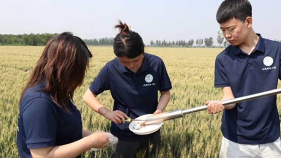 员工们在麦田里取土样