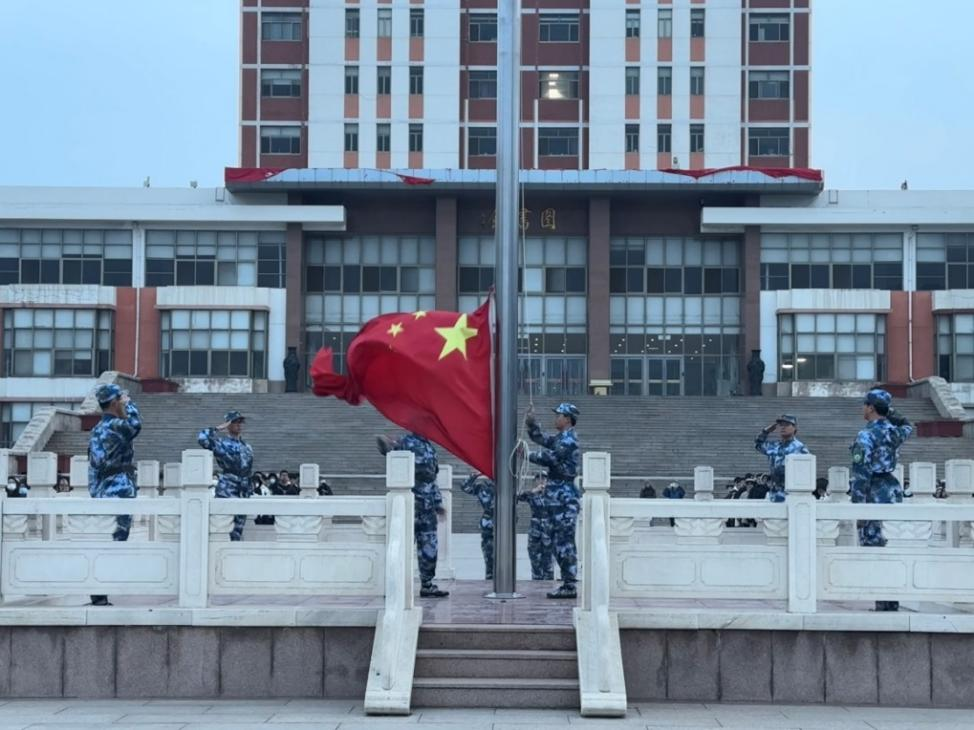 迎着初升的朝阳,国旗护卫队迈着整齐划一、铿锵有力的步伐护送国旗进场。晨风中,伴随着庄严激昂的国歌声,升旗手将国旗高高扬起,五星红旗冉冉升起随风飘扬,全体师生庄严肃立,向缓缓升起的红旗行注目礼,心中的信仰如同那一抹鲜红的旗帜一般迎风飘扬,永不消散。
