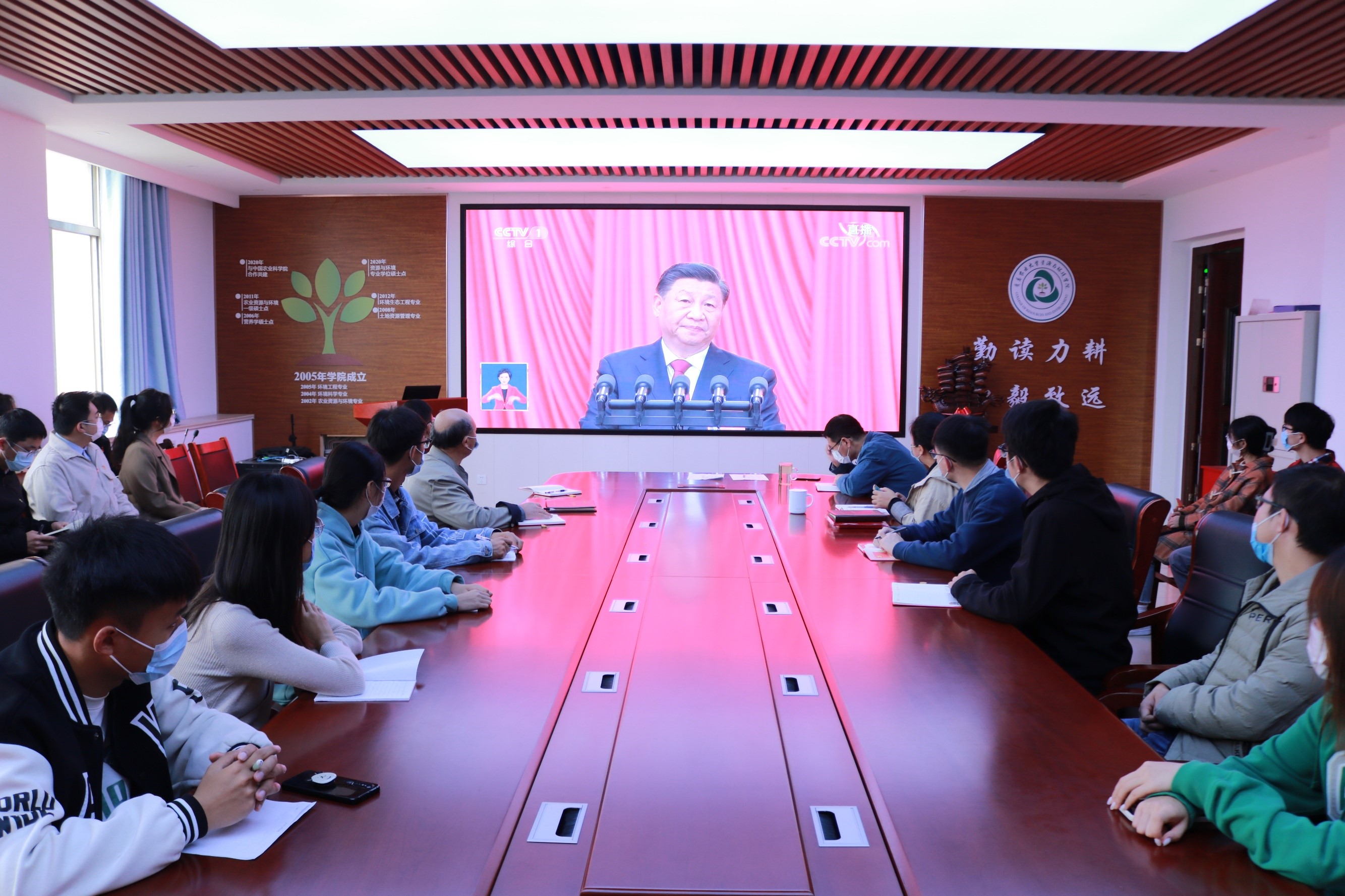 在观看直播现场,广大师生边看边做好记录,并就报告中的新提法、新思想进行探讨和交流,切实把握报告广度和深度,深刻领会报告内涵与意义。