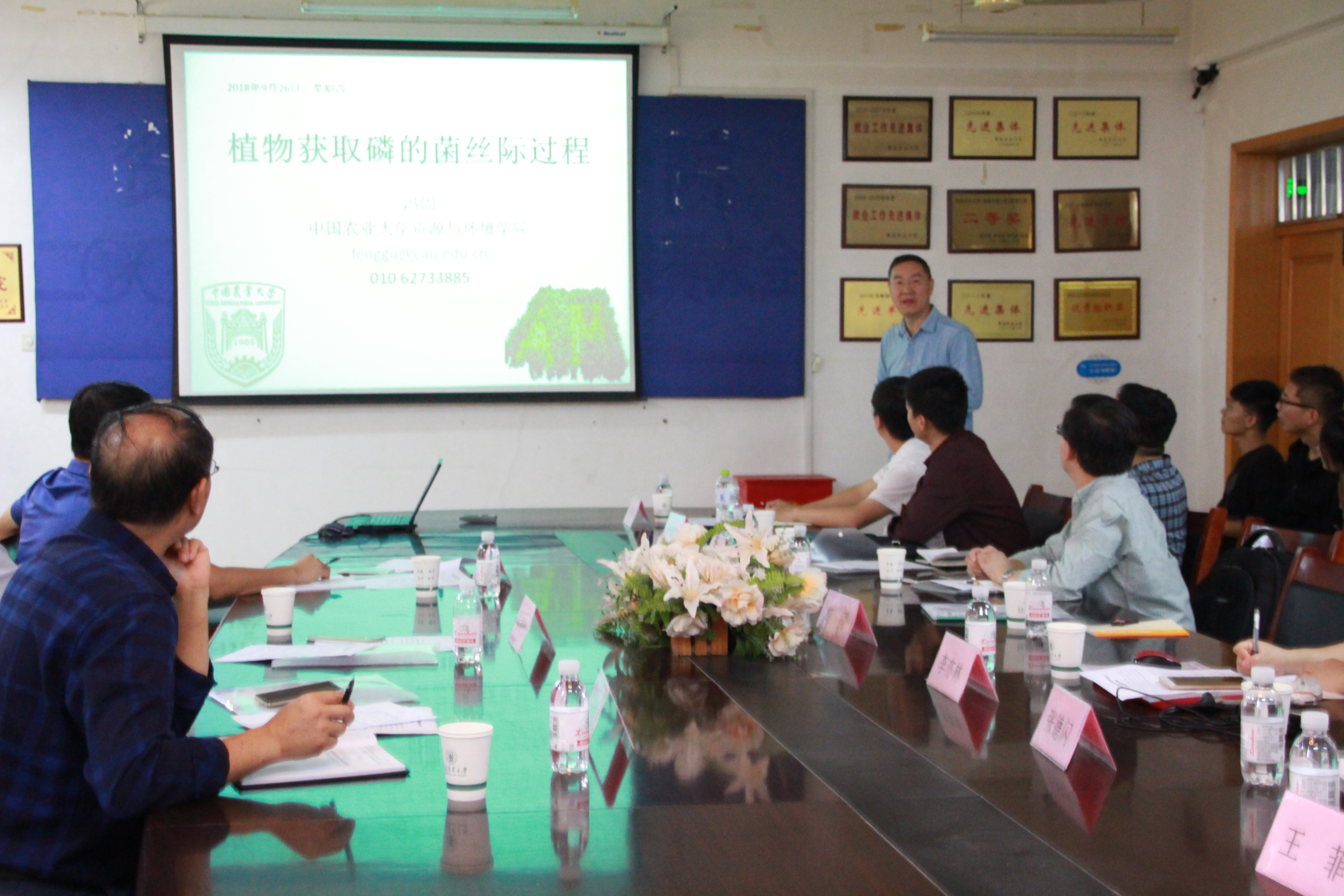 冯固以«植物获取磷的菌丝际过程»为题,主要介绍了菌丝际生长涉及化学、物理和生物学过程。通过图文结合,清晰的讲述了根系和菌根途径的协同机制以及菌根真菌分泌繁殖调节细菌的功能信号是作用机制。报告结束后,冯固针对老师与员工提出的相关问题进行了详细解答。