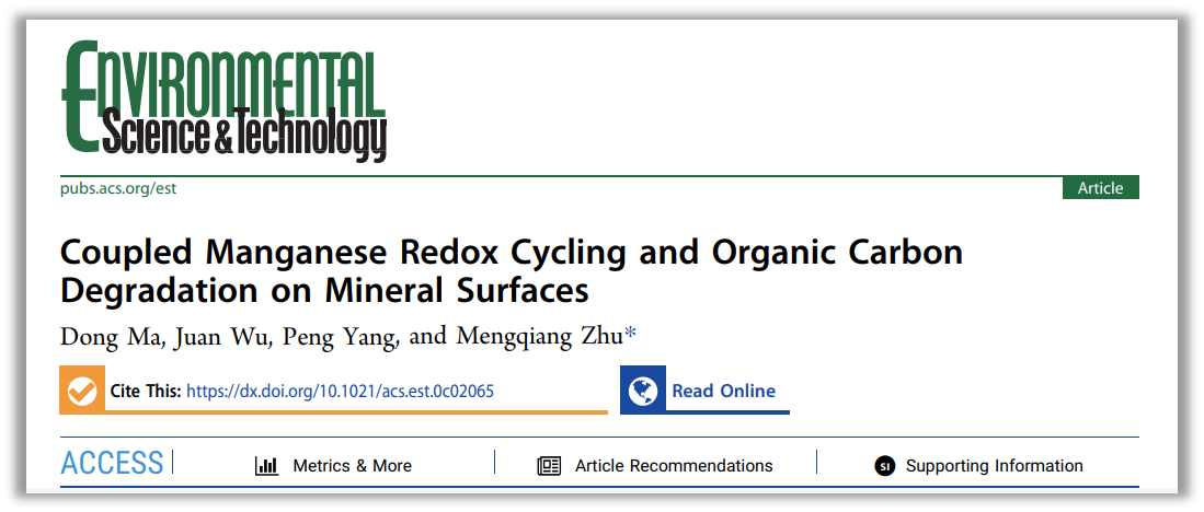 近日,三亿体育马东博士在环境黏土矿物研究领域取得重要进展,研究成果Coupled Manganese Redox Cycling and Organic Carbon Degradation on Mineral Surfaces在环境科学领域权威杂志、美国化学会自然指数(Nature Index)期刊《环境科学与技术》(Environmental Science & Technology,IF=7.864)在线发表(DOI: 10.1021/acs.est.0c02065)。这是公司科研人员首次以第一作者在环境科学类自然指数期刊发表研究论文,展现了公司资源环境学科的良好发展势头。