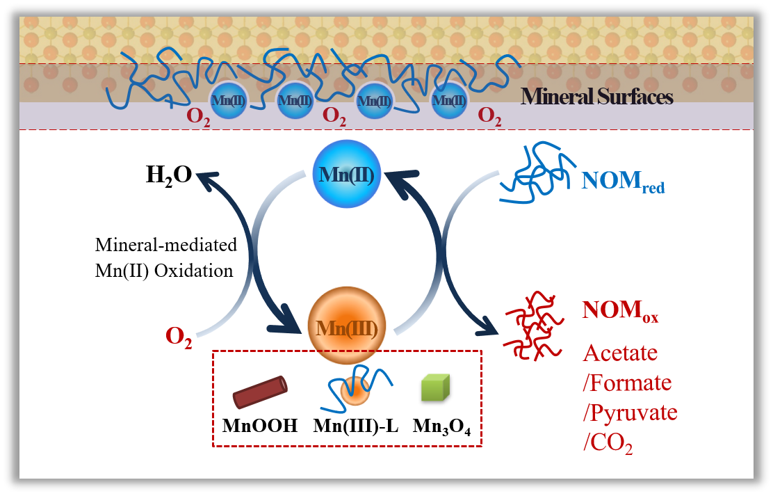 该研究揭示了铁矿物表面的锰氧化还原循环与天然有机物分解的耦合过程,证实了土壤和沉积物中的高价锰矿物对天然有机物的非生物氧化可能是一种重要的天然有机物分解途径。同步辐射X射线吸收光谱等分析结果表明,活性矿物(特别是铁氧化物)可以催化二价锰氧化形成三价锰物种,进而氧化天然有机物,同时在矿物表面产生新的二价锰,进行下一轮氧化/还原过程。该研究工作揭示的土壤和沉积物中高价形态锰对天然有机物的非生物氧化过程,对环境污染物的氧化降解也具有十分重要的理论意义。该研究由美国怀俄明大学Mike Zhu博士共同合作完成。