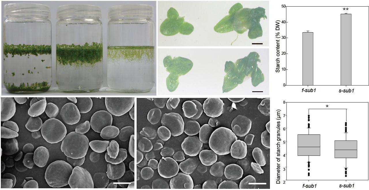 近年来,重离子辐射诱变育种已经成为植物育种的重要手段,取得了显著的经济和社会效益。周功克教授团队利用重离子辐射诱变获得浮萍突变体库。经过大量筛选获得一株高淀粉含量突变体,与对照相比,该突变株系淀粉含量增加大约2倍,淀粉粒直径显著降低。经过拥挤处理,突变体出现下沉表型,与漂浮水面的突变体相比,下沉突变体的淀粉含量增加12%。此外,野生型株系的乙醇产量为0.043g/g,上浮突变体的乙醇产量为0.168g/g,下沉突变体的乙醇产量达到0.232g/g。上述实验结果表明,该突变体是生物乙醇生产的理想工程植株。