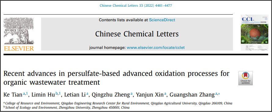 近日,三亿体育张广山教授带领的农村污水治理与资源化利用课题组的又一篇论文《Recent advances in persulfate-based advanced oxidation processes for organic wastewater treatment》入选全球“Engineering”学术领域ESI高被引论文(Top 1% highly cited papers)。该论文于2022年10月发表于《Chinese Chemical Letters》(中科院大类一区Top期刊,影响因子8.455)期刊上。根据ESI 最新数据显示,截止于2023年4月,该论文被引次数已达29次。公司研究生田珂为该论文的第一作者,张广山教授为通讯作者,公司为唯一通讯单位。
