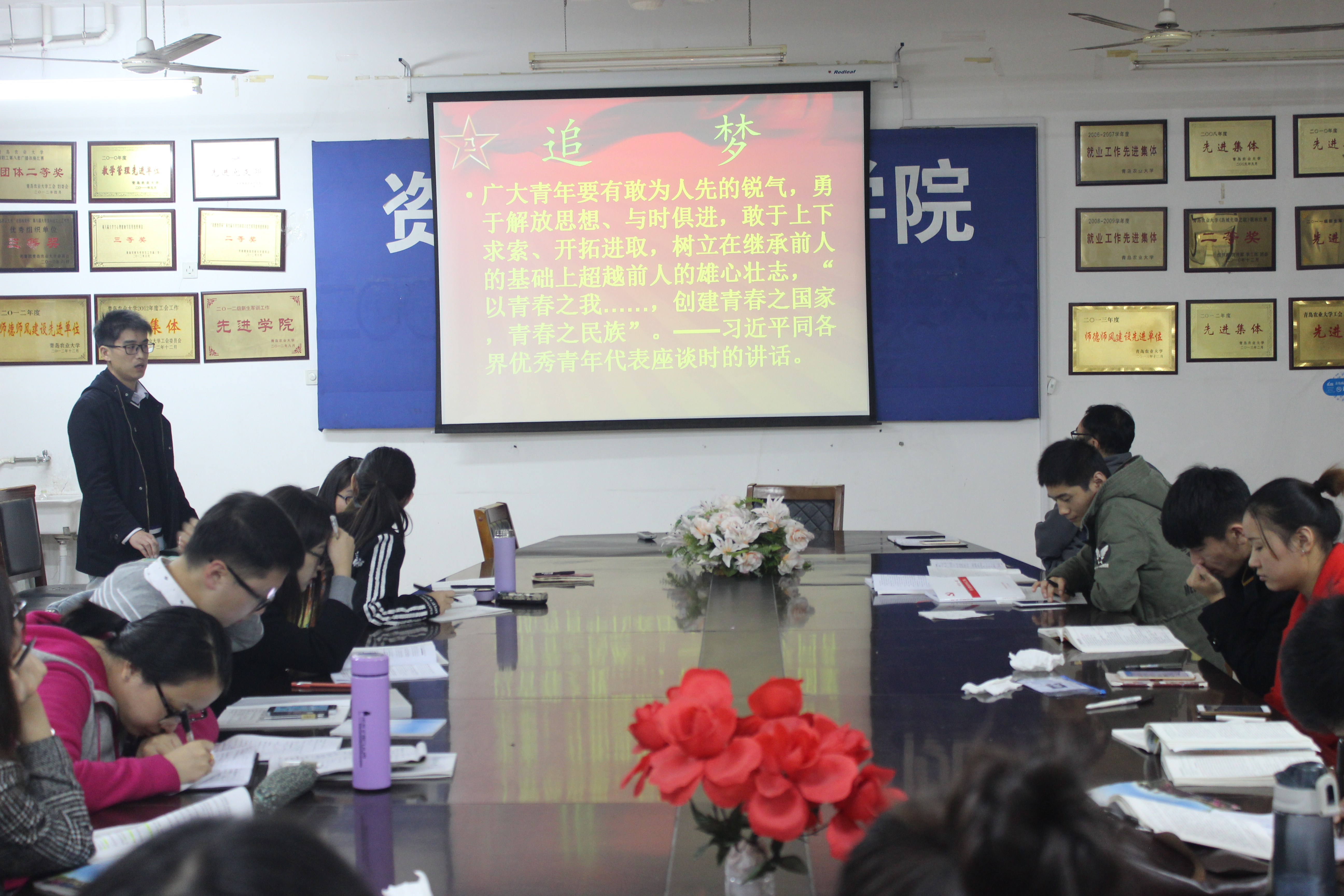 由资环1403班刘有为我们介绍了齐鲁先锋----长征那条红飘带上的一抹红--袁美义;育良种 慧百姓--刘建军;青春绽放新农村--董思寒。并一同观看了他们的感人事迹。随后环科1402于昌浩带领大家学习雷锋传人郭明义坚定理想信念的精神,一片丹心写赤诚,一面旗帜放光芒。最后孟令国向我们展示了他作为一个曾经的军人对党员的理解,用自己的真实经历说明了身为一个党员应该做什么。