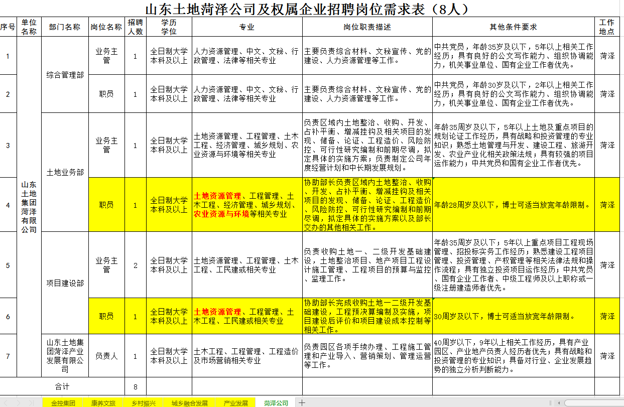 招聘岗位中菏泽公司有2个岗位涉及到:土地资源管理专业,农业资源与环境专业,毕业生可具体查询招聘公告。公告链接如下点击即可获得:http://gzw.shandong.gov.cn/articles/ch00223/202004/f0e982f7-2fb3-4a63-b464-9f423e0a2d88.html