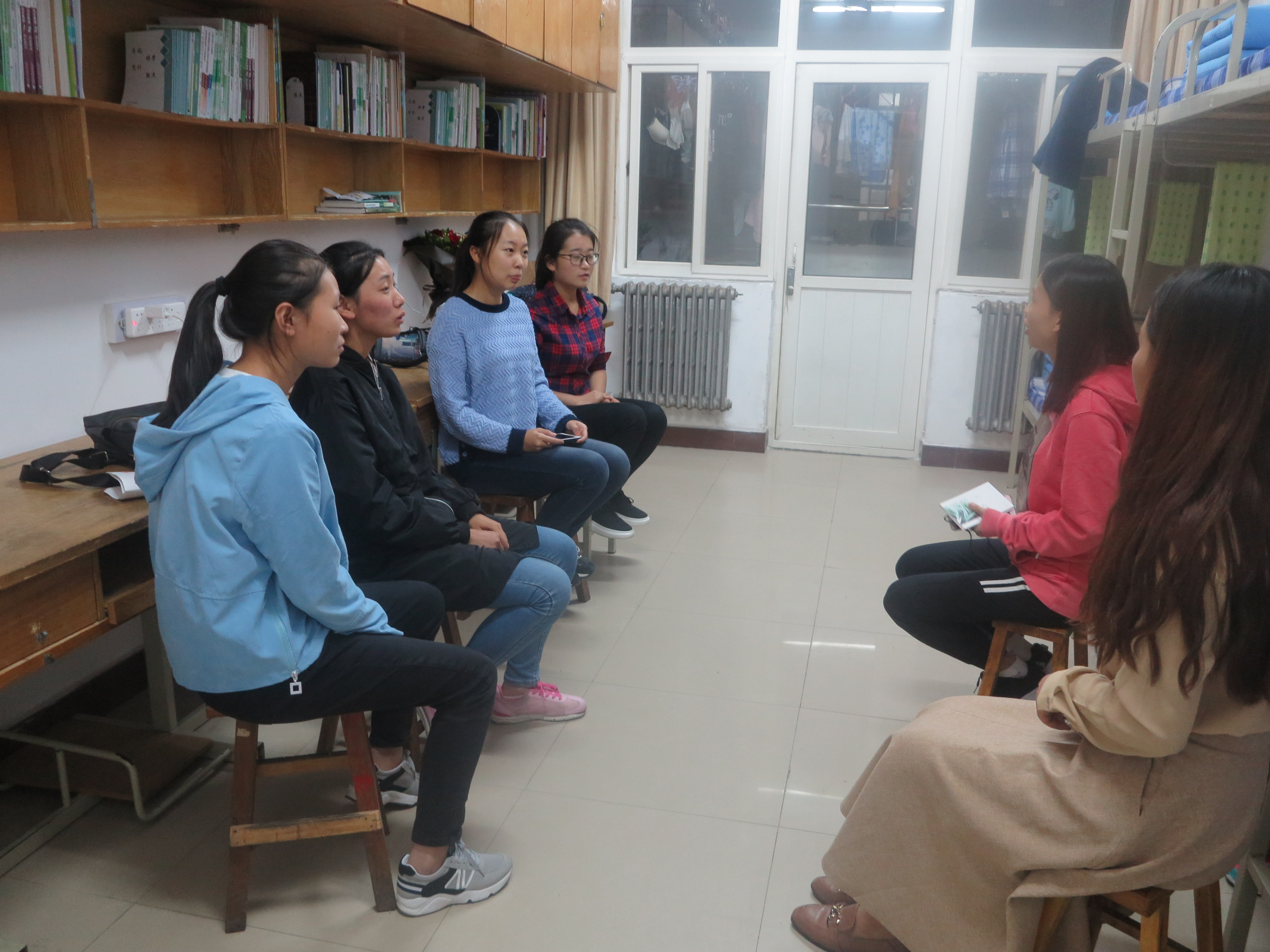 阳光走访的内容主要集中在以下几个方面。首先,不少新生反映在刚入学时非常思念家里。心理发展部成员告诉她们想家对于刚入学的新生们来说是正常的现象,可以通过多融入班集体、学习和课余活动来获得排解并逐步适应老员工活。随后,新生们表示对自己所读专业的未来目标和前景充满了迷茫,学姐则为她们提供了一些求助的途径,例如可以找辅导员、导师以及同专业的学姐学长来了解相关信息,并告诉她们,要对自己所选择的专业有信心并肯为之付出努力。