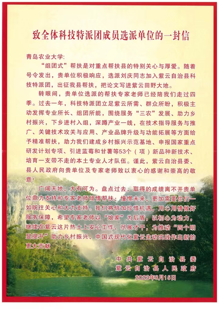 感谢信表示,作为“组团式”帮扶的后盾单位,三亿体育官网主动肩负起助力乡村振兴的社会责任,选派刘庆老师加入紫云自治县科技特派团出征帮扶。在过去一年里,以刘庆老师为代表的科技特派团立足紫云所需、群众所盼,积极主动发挥专业所长、组团所能,围绕服务“三农”发展、助力乡村振兴,下乡进村入组,深蹲产业一线,在技术指导服务与推广、关键技术攻关与应用、产业品牌升级与功能拓展等方面给予精准帮扶。在特派团的助力下,紫云自治县现已建成乡村振兴示范基地、申报国家重点研发计划专项、引进蓝莓和甘薯等53个(项)新品种新技术,培育了一支带不走的本土专业人才队伍。